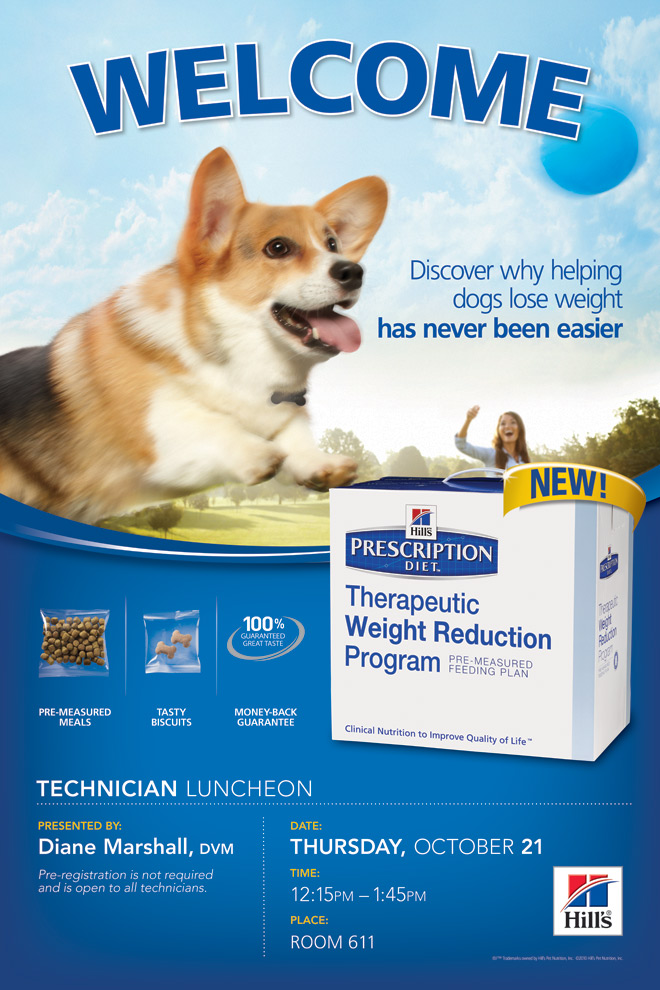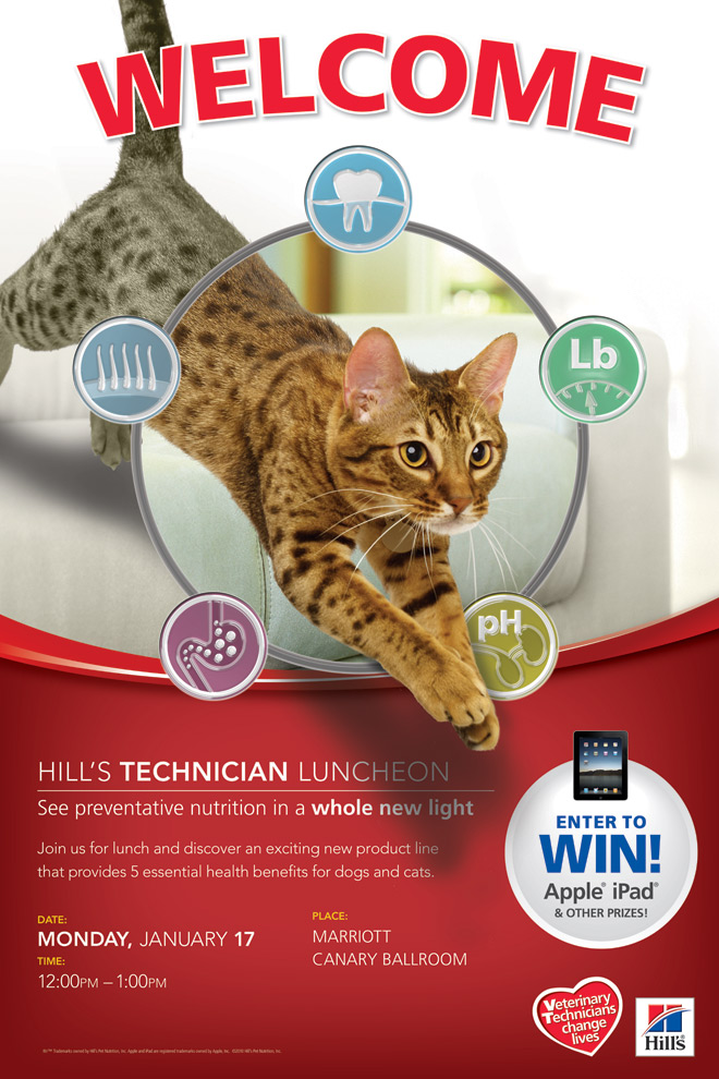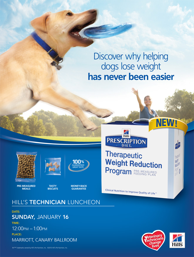 I tackled various design tasks all involving Hill’s Prescription Diet and Hill’s Science Diet. These tasks vary from consumer to clinical promotion. A large portion of design contributed to veterinary conference environmental design. One of the campaigns advertised Hill’s Prescription Diet’s Therapeutic Weight Reduction Program. This program battles against obesity to gain a more healthy lifestyle for your beloved pet. The program offered a kit, shown in both the luncheon poster and awareness ad, including pre-measured food bags, biscuits and informative collateral to assist your furry family member in its fight against obesity.