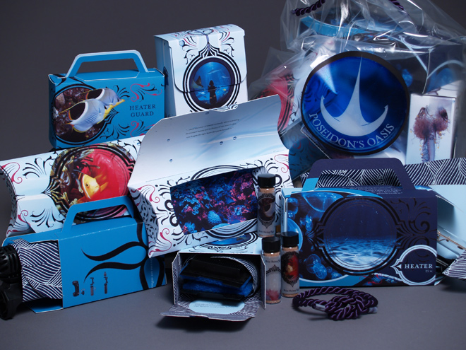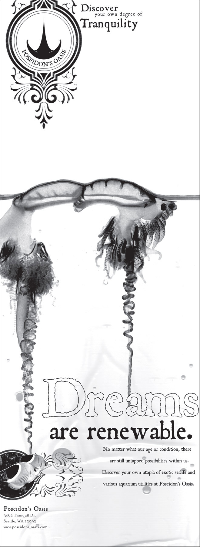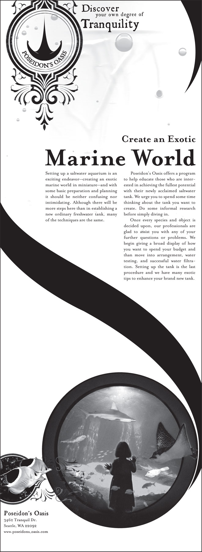 This brand identity project is a mock exotic aquatic store called Poseidon’s Oasis. The entire project is a kinetic design geared toward an upper scale, mid-life to retired life style. This project demanded great attention to detail and creative writing. The brand consisted of logo design, three newspaper ads, packaging and stationary set.